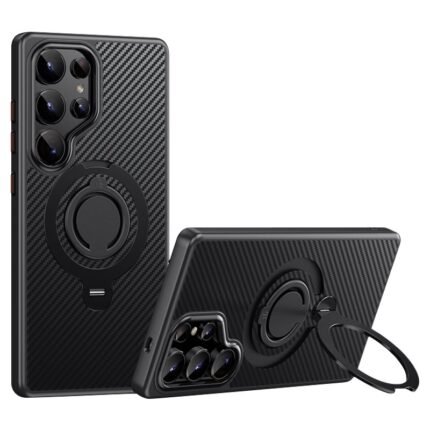 Samsung Galaxy S25 Ultra 5G Carbon Fiber MagSafe Phone Case with 360 Degree Rotating Holder(Black)