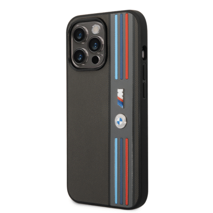 BMW M Collection PU Leather Mesh Case With Tricolor Lines For iPhone 14 Pro Max – Grey