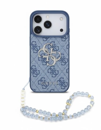 Guess MagSafe Leather Case for iPhone 17 Pro Max in blue with wrist strap, premium leather design, MagSafe compatible, slim, stylish, and protective.