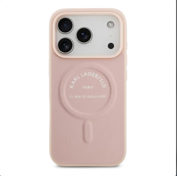 The Karl Lagerfeld MagSafe PU Case for iPhone 17 Pro Max Pink combines premium PU leather, chic RSG logo buttons, slim protection, and full MagSafe compatibility for effortless charging and everyday style.